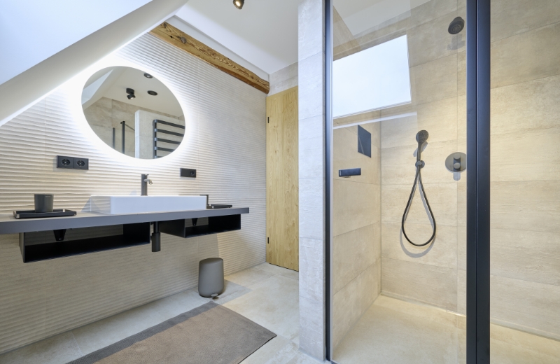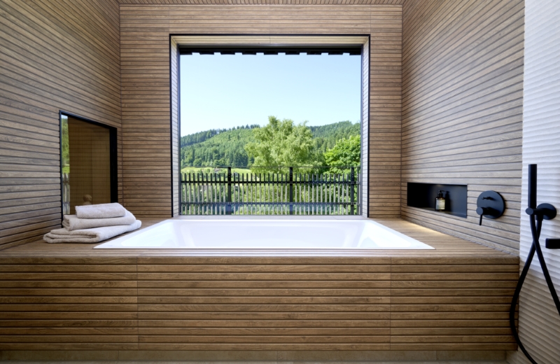Das Masterbad der Bergforelle ist ein Ort der Ruhe und Regeneration – ausgestattet mit einer großzügigen Multifunktions-Sauna (Infrarot, Finnisch, Dampf), einer Badewanne mit großartigem Panoramablick in das Tonbachtal.