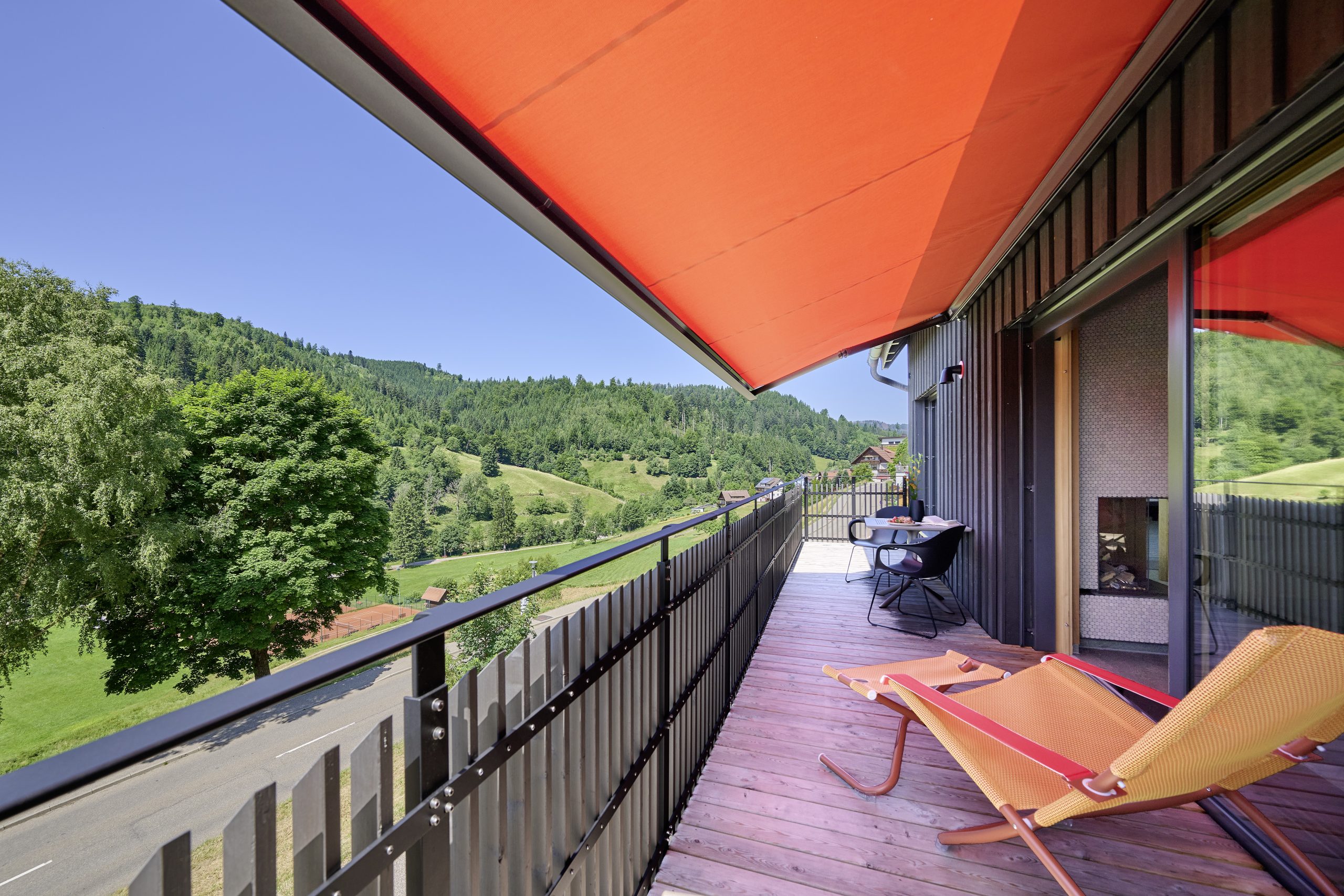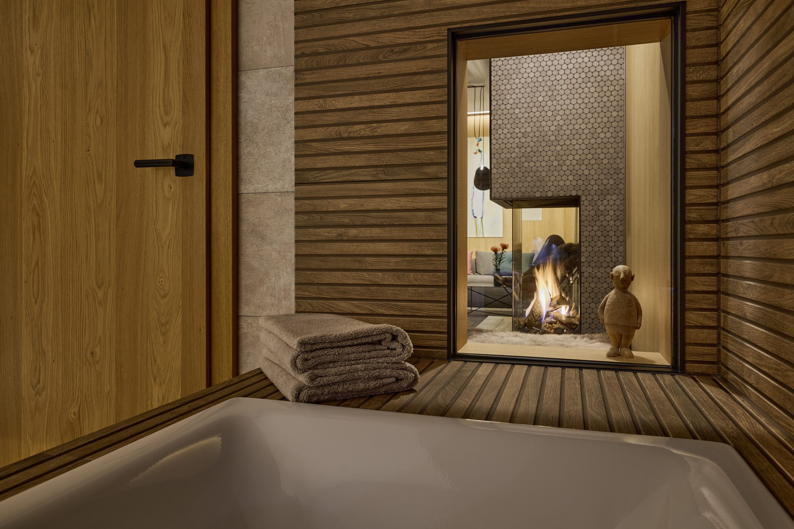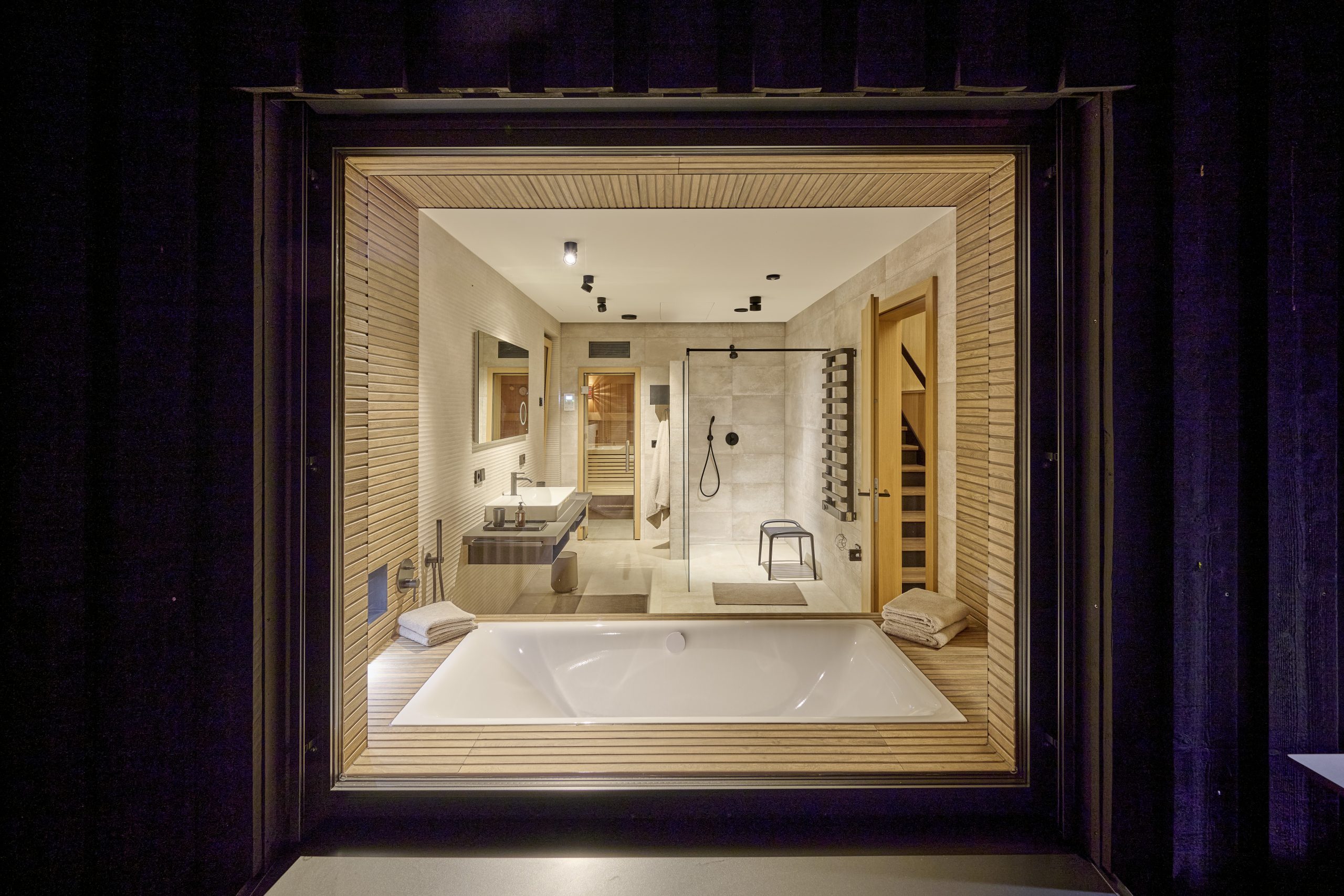 Das Masterbad der Bergforelle ist ein Ort der Ruhe und Regeneration – ausgestattet mit einer großzügigen Multifunktions-Sauna (Infrarot, Finnisch, Dampf), einer Badewanne mit großartigem Panoramablick in das Tonbachtal.