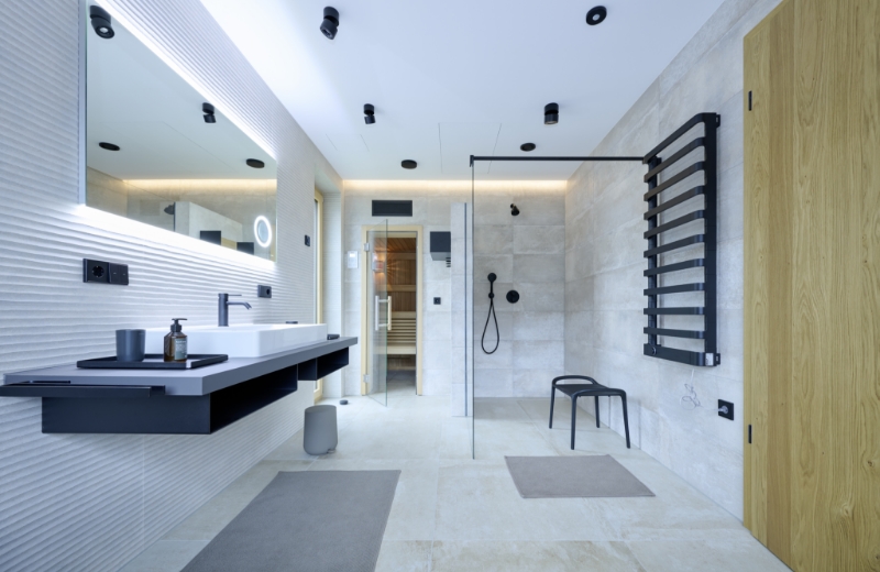 Ein luxuriöses Masterbad mit Sauna, exponierter Wanne mit Blick ins Tal, einer großen begehbarem Dusche sowie ein weiteres elegantes Duschbad im OG sorgen für Komfort und Privatsphäre.