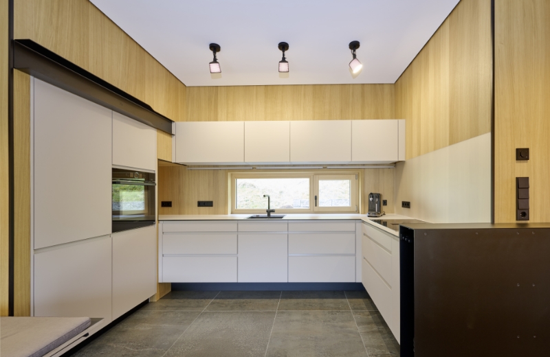Übergänge zwischen Kochen, Essen und Wohnen sind fließend gestaltet, die Blickachsen bewusst gesetzt – vom Kamin bis zur Talsohle. Die bewusste Materialwahl lässt den Charakter der ehemaligen Kapelle subtil weiterleben, ohne sich aufzudrängen. Die Architektur bleibt dabei stets im Dienst der Atmosphäre: zurückhaltend, souverän und still präsent.