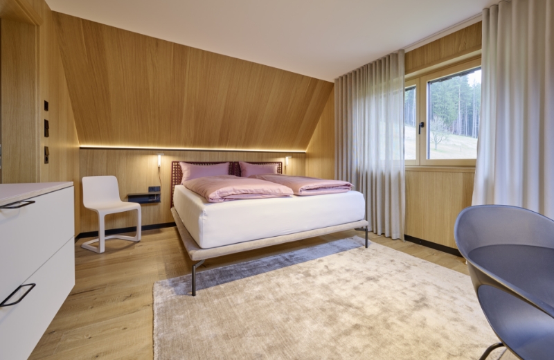 Die Schlafzimmer der Bergforelle sind Rückzugsorte voller Ruhe, Licht und klarer Linien. Jedes Zimmer wurde mit Sinn für Proportion, hochwertige Materialien und dezente Farbwelten gestaltet – ideal für erholsamen Schlaf und entspannte Stunden mit Blick ins Grüne. Großzügige Fenster, feinste Bettwaren und handverlesene Details schaffen ein Ambiente, das nicht aufdrängt, sondern wirkt.